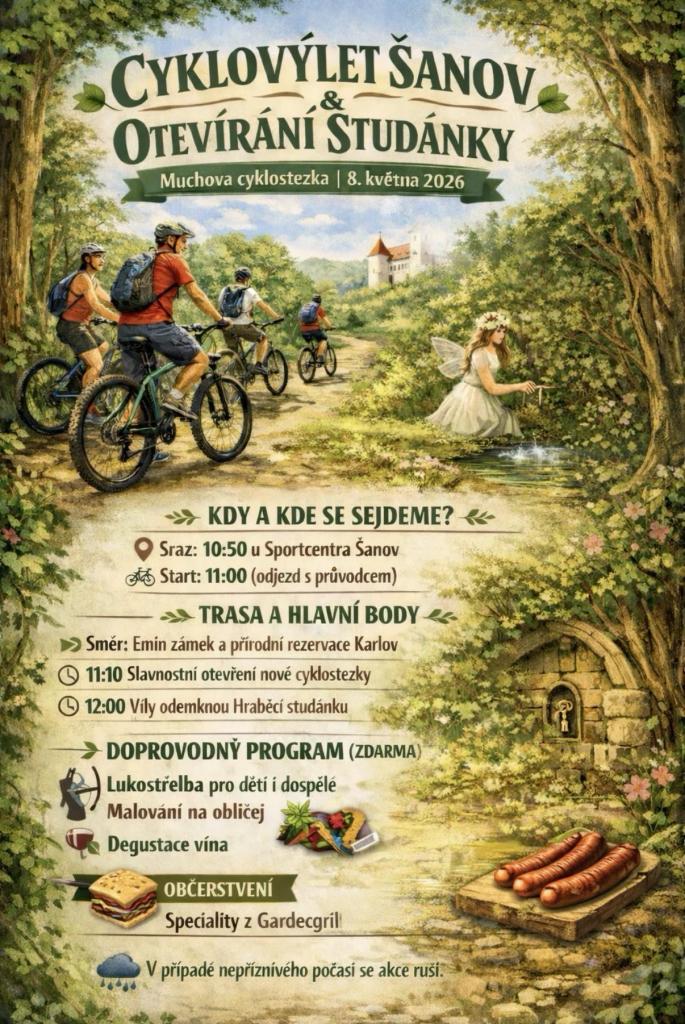 Sraz je naplánován na 10:50 u Sportcentra Šanov, odkud se v 11:00 společně vyrazí na trasu s průvodcem. Tento výlet je skvělou příležitostí pro všechny, kteří mají rádi přírodu a cyklistiku. Připojte se k nám a užijte si krásné výhledy a příjemnou atmosféru.
